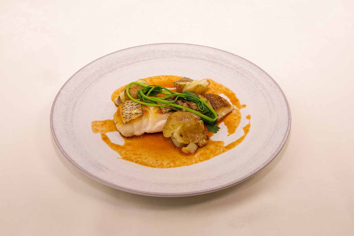 Poisson:鯛のポワレ 新じゃがと春せり添え 甘海老のビスクソース